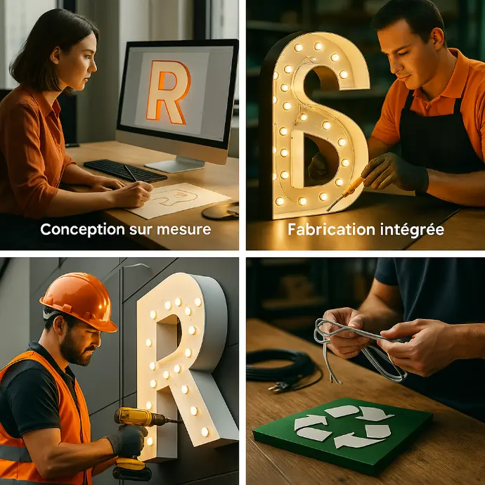 Chaque enseigne est conçue selon votre identité : typographie, couleurs, matériaux, éclairage, dimensions…